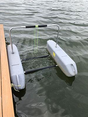 Only one minor issue. When I stand on the pontoon to wrap the bow line around the handrail in preparation for getting in the kayak, my weight is enough to depress the rollers and the kayak floats free. We had a combination of breeze and tide that promptly wanted to wash the kayak out of the YAK-A-LAUNCHER™. But it really is a minor issue now that I’m aware of it.